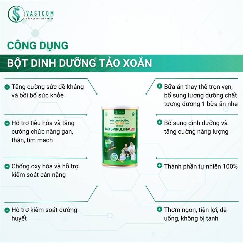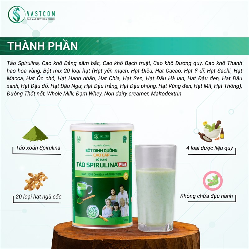Sản phẩm Bột dinh dưỡng cao cấp VASTCOM bổ sung Tảo Spirulina – Hộp 500g là thực phẩm bổ sung dạng bữa ăn thay thế giàu dinh dưỡng, chứa các thành phần Tảo xoắn Spirulina, hơn 20 loại hạt ngũ cốc dinh dưỡng, các loại cao đông y,… Giàu Protein, Vitamin (A,B,C,D,E,PP,…), khoáng chất (Sắt, Kẽm, Magie, Canxi,…), các chất chống oxy hóa (Phycocyanin, Beta-caroten). Sản phẩm không chỉ giúp bổ sung dinh dưỡng thay thế cho một bữa ăn nhẹ mà còn ổn định đường huyết, tăng cường đề kháng, cải thiện tiêu hóa, tốt cho tim mạch và phòng chống ung thư & đột quỵ, phù hợp với nhu cầu chăm sóc sức khỏe toàn diện.