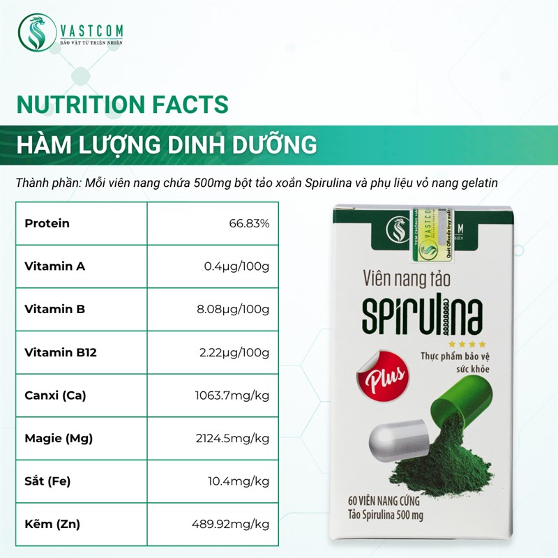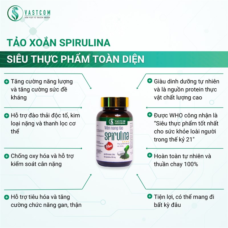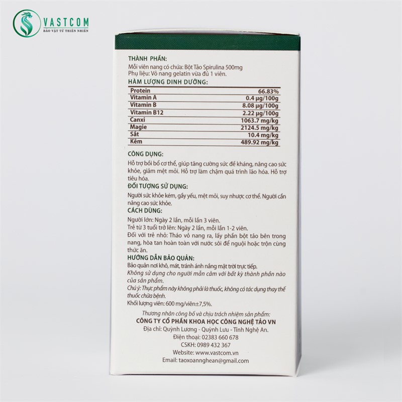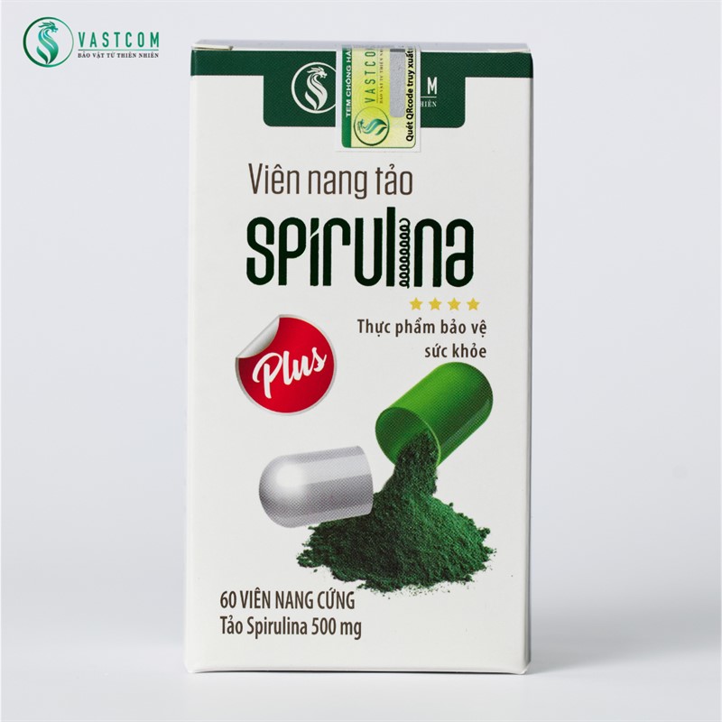 Sản phẩm Tảo xoắn viên nang Spirulina VASTCOM – Hộp 60 viên là thực phẩm bảo vệ sức khỏe có nguồn gốc thiên nhiên, được chiết xuất từ thành phần Tảo xoắn Spirulina. Với thành phần giàu Protein, Vitamin (A,B,C,D,E,PP,…), khoáng chất (Sắt, Kẽm, Magie, Canxi,…), các chất chống oxy hóa (Phycocyanin, Beta-caroten), Tảo xoắn Spirulina giúp tăng cường đề kháng, bổ sung dinh dưỡng, cải thiện tiêu hóa, cải thiện đường huyết, tốt cho tim mạch và phòng chống ung thư & đột quỵ, phù hợp với nhu cầu chăm sóc sức khỏe toàn diện.