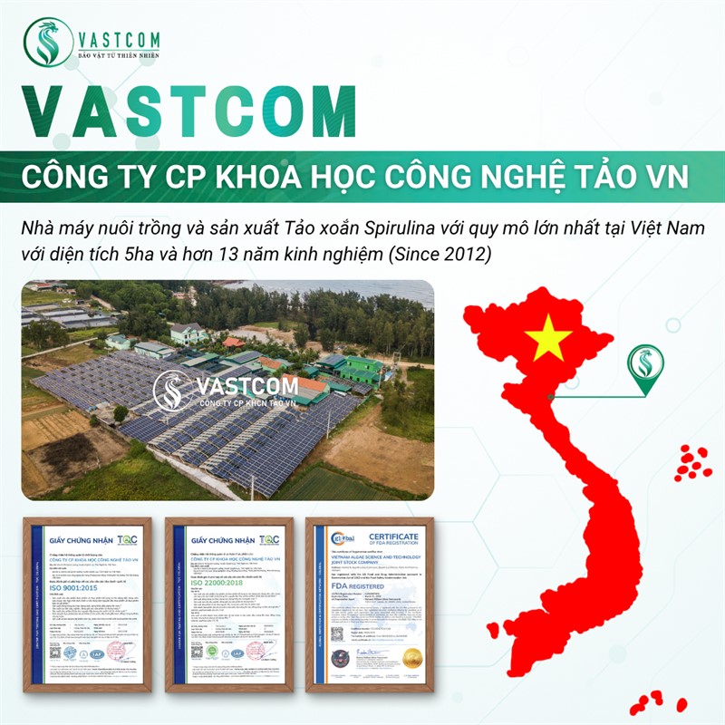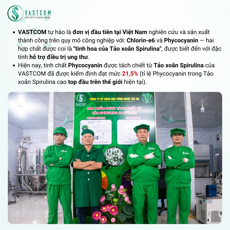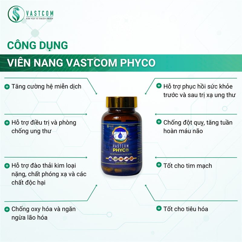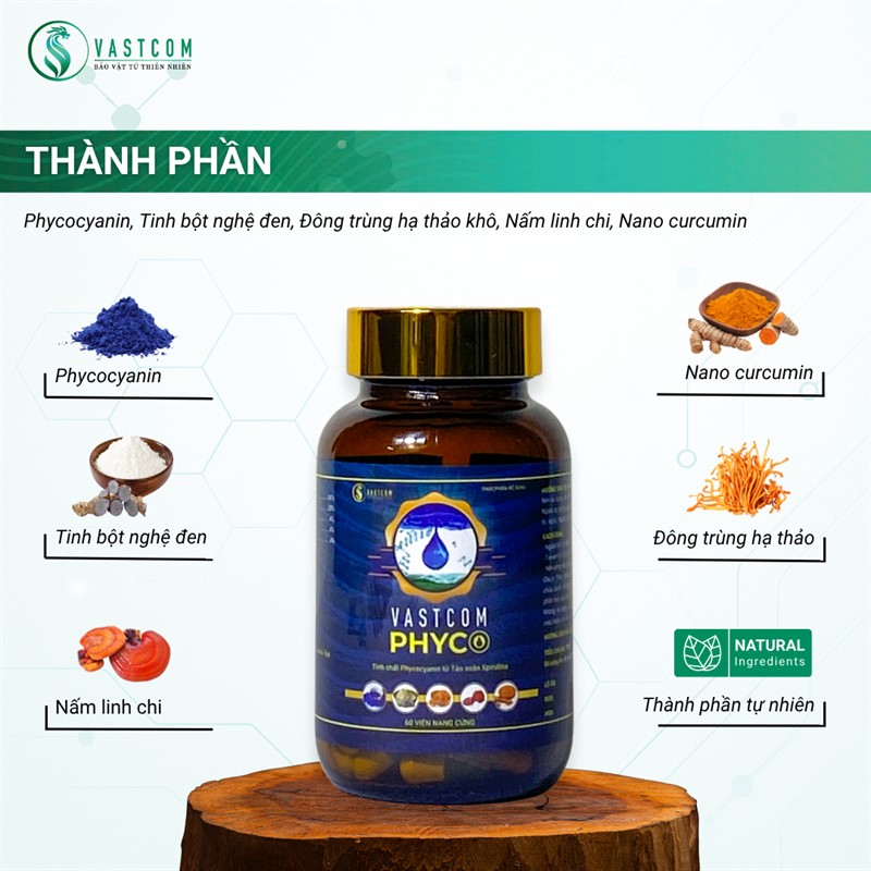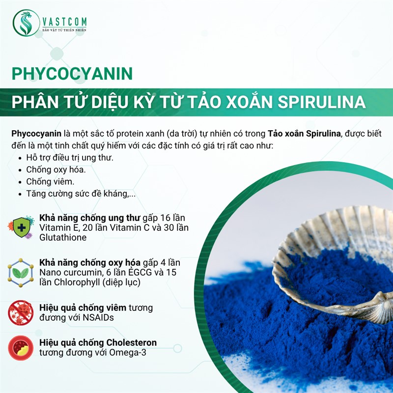 Sản phẩm Viên nang Phycocyanin VASTCOM Phyco – hộp 60 viên thực phẩm bổ sung được chiết xuất từ Phycocyanin – hoạt chất quý hiếm có trong Tảo xoắn Spirulina. Phycocyanin là chất chống oxy hóa mạnh, hỗ trợ bảo vệ tế bào, tăng cường miễn dịch, thanh lọc cơ thể, làm đẹp da, và đặc biệt có tiềm năng hỗ trợ phòng ngừa và điều trị ung thư, viêm nhiễm, dị ứng và lão hóa. Sản phẩm được bào chế dạng viên nang tiện lợi, dễ hấp thu, phù hợp với nhu cầu chăm sóc sức khỏe chuyên sâu.