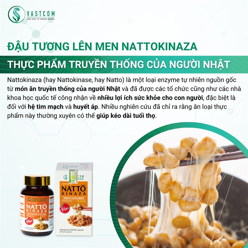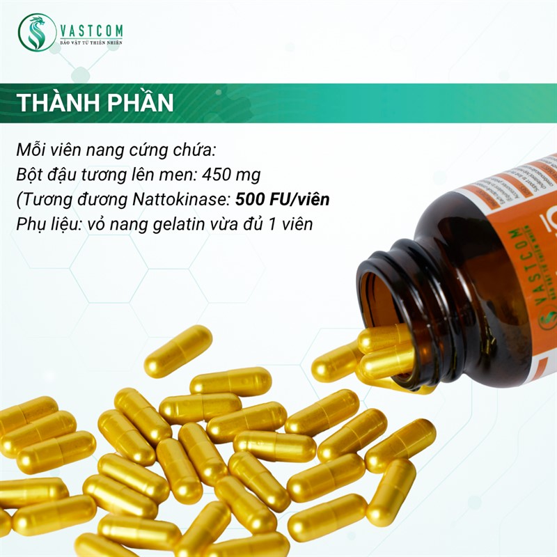 Sản phẩm Viên nang VASTCOM Natto Kinaza là thực phẩm bảo vệ sức khỏe có nguồn gốc từ đậu tương lên men truyền thống của Nhật Bản, chứa hoạt chất Nattokinase – một enzyme sinh học quý giá được khoa học chứng minh có khả năng chống hình thành cục máu đông, cải thiện tuần hoàn máu, hỗ trợ phòng ngừa đột quỵ và tai biến mạch máu não.